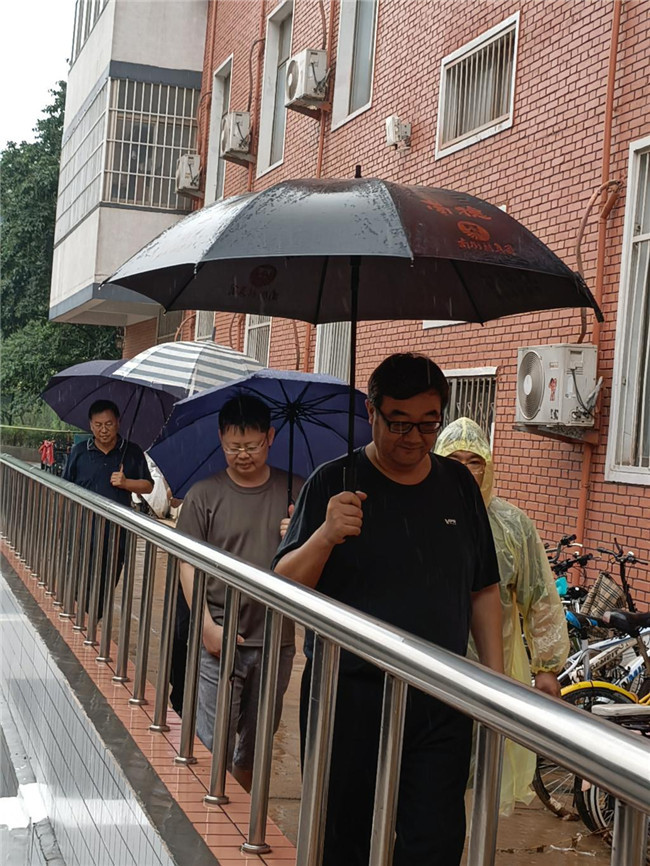 执行董事王新奇、副校长张金安、副校长张其武冒雨查看校园汛情