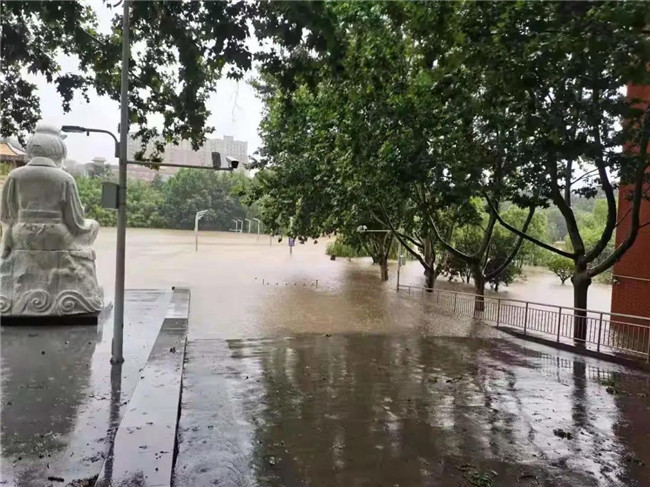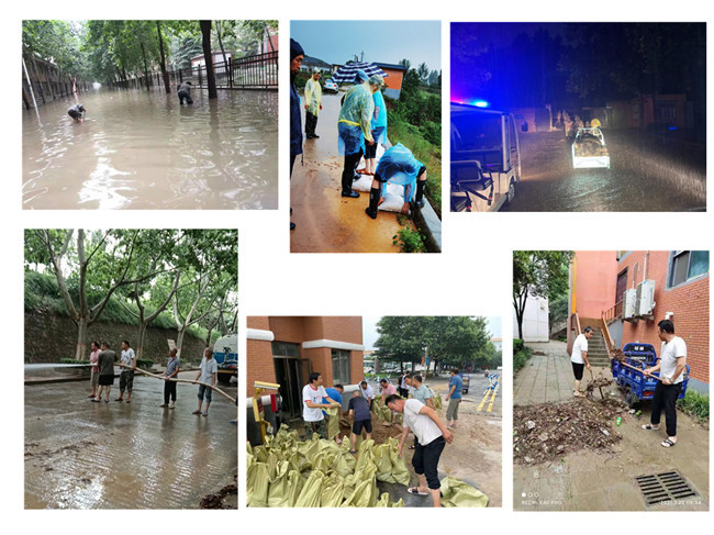 不畏暴雨,靠前指挥。连日暴雨导致校园积水严重,部分区域短时间内积水达十余米深,部分楼宇进水,情况危急。学校董事会及董事长王淑芳高度重视汛情,校领导王新奇、郭爱先、张金安、张其武,身先士卒、靠前指挥,迅速组织力量防汛救灾,带领总务处人员及各一线值班人员,冒雨对防洪关键部位进行疏导,对重点位置设置沙袋,对淹没区域水电进行安全切断处置,对危险区域设置警戒线,严防次生灾害,保障全校师生生命安全及基本水电供应和道路畅通。