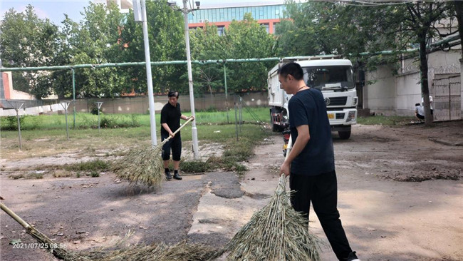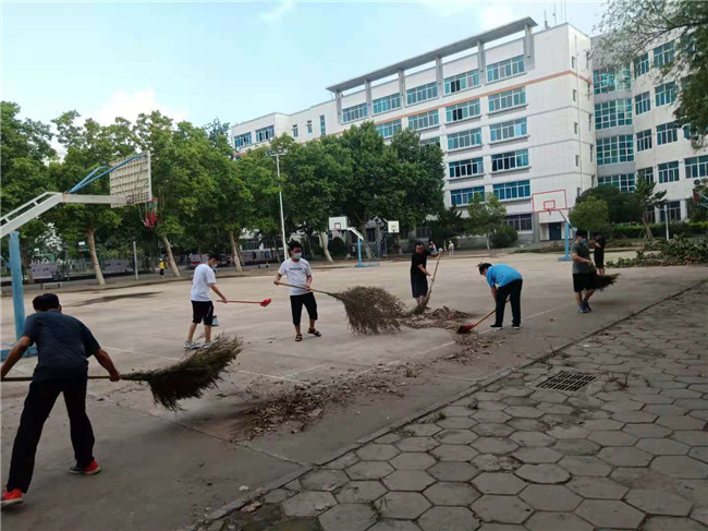 “你们去篮球场清理绿地上的枯枝落叶,我们在这边清扫路面杂物……”杨宝进一行带领教师志愿者,从学生公寓门口出发,分为南、北两队,分别对校园内、第一家属区、第二家属区等地汛后遗留的垃圾物进行全面清理打扫。老师们拿起扫帚,一边清理路面的淤泥,一边清扫路面的落叶及杂物,力争尽快恢复校容校貌。清扫过程中,大家分工明确,方法得当,效果明显,校园的路面、大门口、教学楼广场等处,很快恢复了往日的良好面貌。