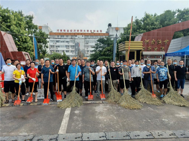 前期,经过广大师生员工的共同努力,河南牧业经济学院北林校区校园积水已经清理完毕,遗留下来的淤泥、垃圾影响校园整洁。7月25日上午,副校长杨宝进带领百余名教师志愿者深入校园、家属区重点部位,开展汛后清淤清扫工作。