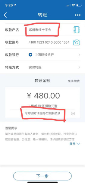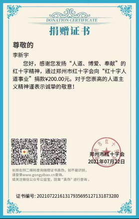 文法学院教师李新宇在得知郑州红十字会捐款渠道后,立刻向郑州红十字会捐款200元,以尽自己的一份心意。李新宇说:“这次河南遭受洪涝灾害,身为河南人,虽然我家庭负担重,但是哪怕能为奋战在一线的志愿者买瓶水也是我的一点心意。”