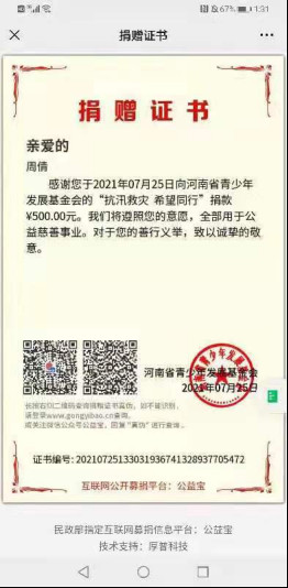 校团委周倩老师捐款500元,她说:“多处基础设施被毁、农田被淹、房屋倒塌,很多人无家可归,武警部队,解放军,人民子弟兵,全国各地爱心人士纷纷驰援河南,各条战线的爱心人士纷纷捐钱捐物,我作为一名教师,一名拥有18年党龄的老党员,理应献出自己的一份爱心。”