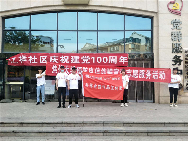 根据学校今年暑期“三下乡”社会实践活动的通知要求,7月7日至11日,在人事处教师王康同志的带领下,焦作大学“助力文明创建,防范电信诈骗”宣讲团成员赴焦作市山阳区多个社区开展宣讲活动,向社区居民普及防诈骗常识。