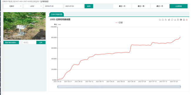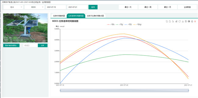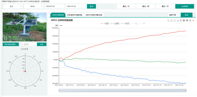 6月中旬,该系统采集到位移及裂缝形变数据,通过大数据后台分析及智能化决策系统对监测区域自动发布了多次分级别的滑坡预警,施工单位针对预警信息及时采取了坡体防雨、防渗防护、坡顶排水沟硬化,加快抗滑桩基坑施工,专职安全员实时观测等防范措施。