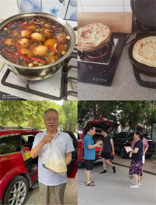 当得知救援部队、受灾群众需要油饼、煮鸡蛋等食物时,该校教职工闻“讯”而动,“豫”爱同行。退休干部王党亲、退休教师赵亮等纷纷在家自己动手烙起了一摞摞的油饼;文法学院孙琼阁、马克思主义学院周英洁、工商管理学院李利晓、外国语学院张静等在家煮起了茶叶蛋;为了预防天热食物变质,物流与电商学院梁金萍老师买下该校英才校区丹尼斯店的全部的独立包装卤鸡蛋,人事处王勇老师购买了变蛋;退休干部刘德著、赵金祥,金融与会计学院赵桂珍等捐献了牛肉、咸鸭蛋、红枣、日用药物等物品支援救灾一线。他们用自己的实际行动传递爱,彰显河南牧业经济学院精神。