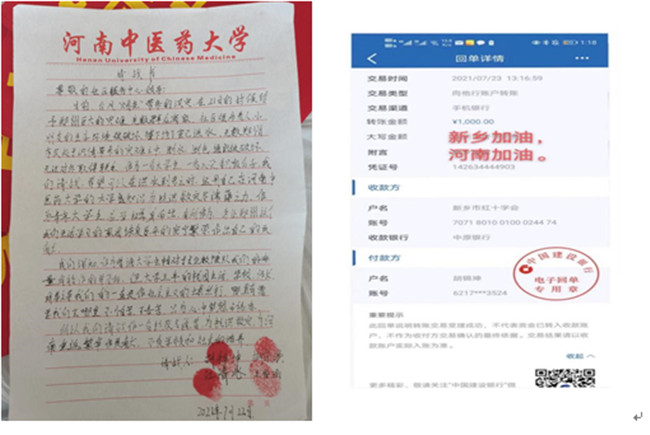 管理学院2018级学生胡锦坤听闻郑州市汛情严重,从家乡返郑后,在无水无电的出租屋里,以河南中医药大学入党积极分子的身份写下了申请加入抗洪救灾志愿者行列的请战书。第一时间向社区请战加入志愿者行列,疏散群众、发放救灾物资、帮助老人搬出被泡物资、疏通道路等。郑州汛情稍有缓解,新乡又下起了大暴雨,胡锦坤尽己所能,把攒下来的1000元钱汇给了新乡红十字会用于救灾。