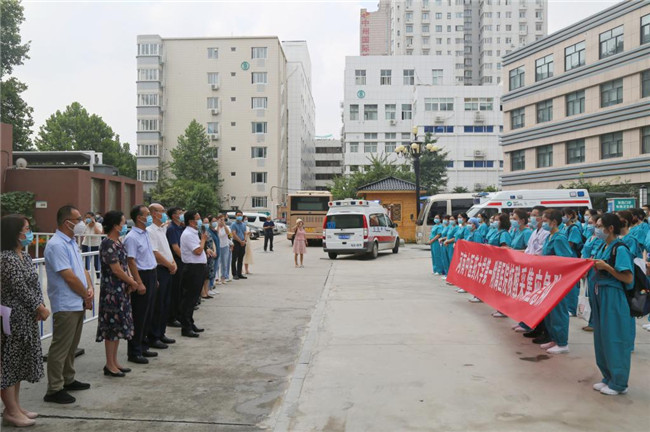 在送行第一批核酸检测队伍的出征仪式上,医院院长朱明军动情的说:“中医一附院是有着红色基因的医院,我们要弘扬红色的精神血脉,在国家和人民需要的时刻奋勇当先,这是我们义不容辞的必须胜利完成的任务,也是河南中医一附院人必须应有的担当!”