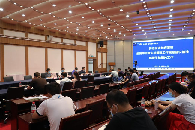 8月9日全省教育系统举行疫情防控暨灾后重建工作视频会后,郑州升达经贸管理学院分别于8月9日下午和8月10日下午,召开疫情防控指挥部工作会和全校专题视频会议,传达学习全省教育系统疫情防控暨灾后重建工作视频会议精神,贯彻落实相关工作任务要求。全体校领导及各工作专班组长、各单位主管、在校行政人员通过线上和线下参加会议。