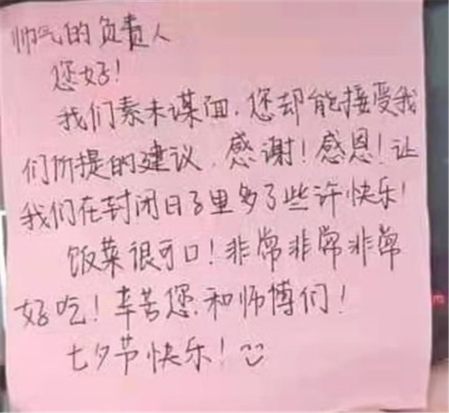 “帅气的负责人,您好!我们素未谋面,您却能接受我们的建议......让我们在封闭的日子里多了些许快乐!饭菜很可口,非常非常好吃!......七夕节快乐!”