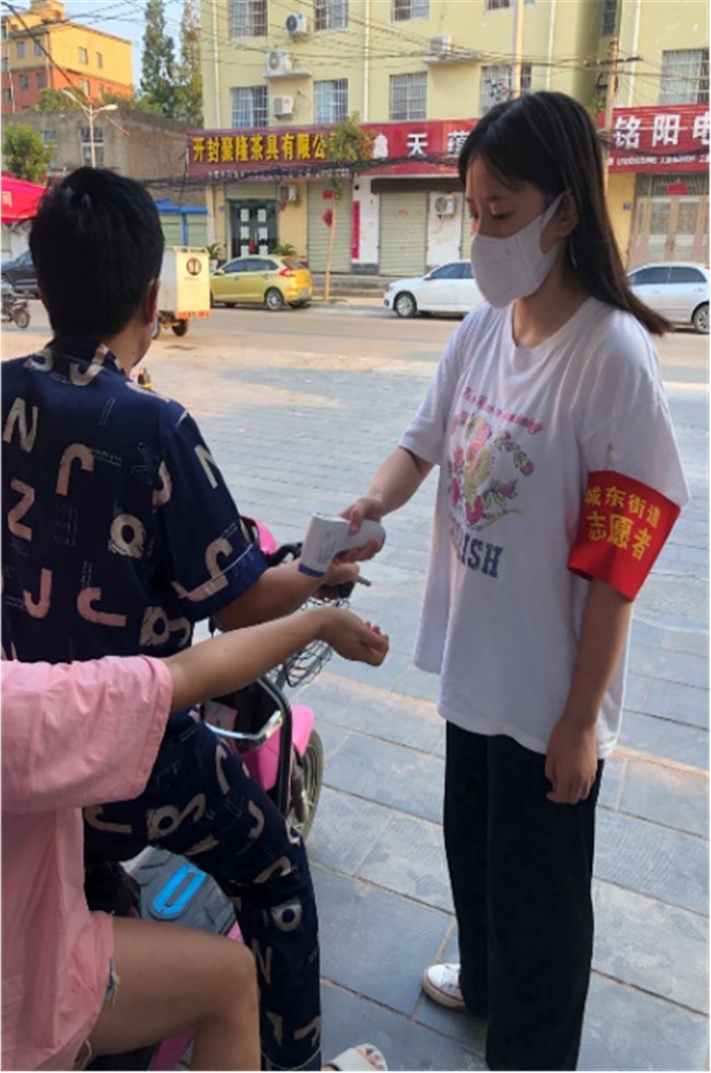 在进行了规范的志愿服务培训后,张鑫雨如愿加入疫情防控工作队伍。她了解到开封市城东街道管辖人员一百多人,要排查祥符区几十万人口,任务艰巨,同样也很神圣。她带着使命感加入这次防控疫情大家庭中,一方面把业主卡发放到位,量测居民体温,户主填写信息以及签订疫情防控承诺书,查验行程码和健康码,发现码异常人员及时沟通。另一方面,协助城东街道办事处,组织群众做核酸检测,维持队伍秩序,保持距离提醒,防疫知识宣传。