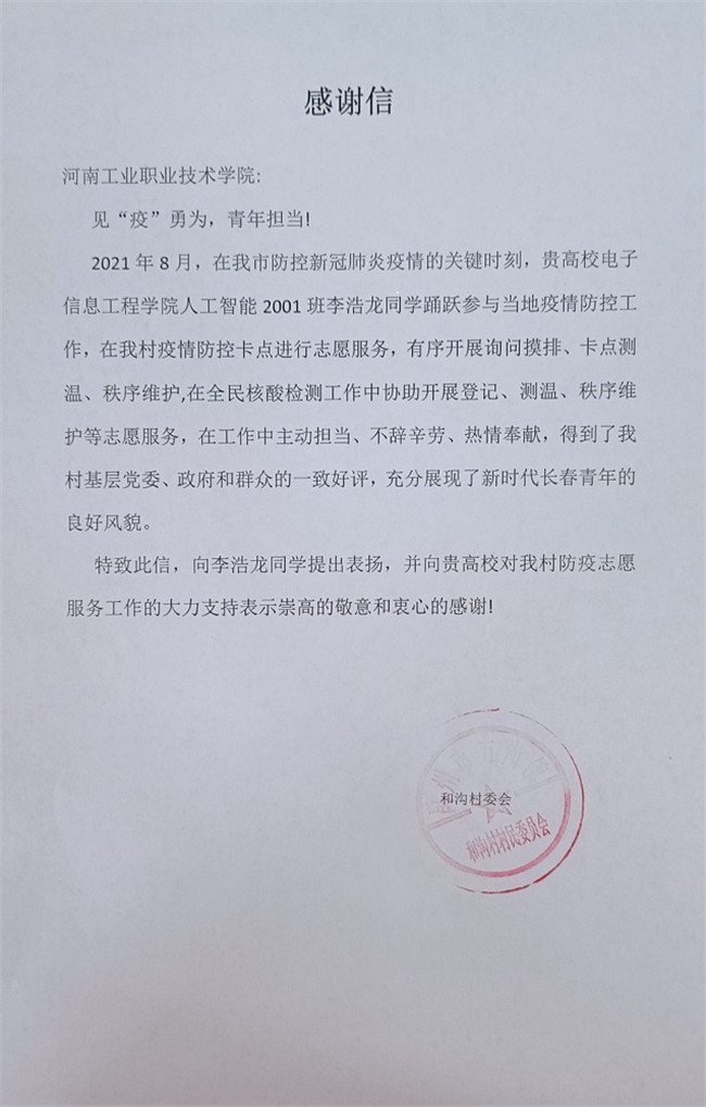 从防汛到防疫,哪里有需要,哪里就有河南工业职业技术学院青年学子的身影,在这场没有硝烟的阻击战中,他们用青春诠释战“疫”担当,构筑起一道道“青春防线”,彰显新时代青年的责任和担当。(魏豪 刘天恒)