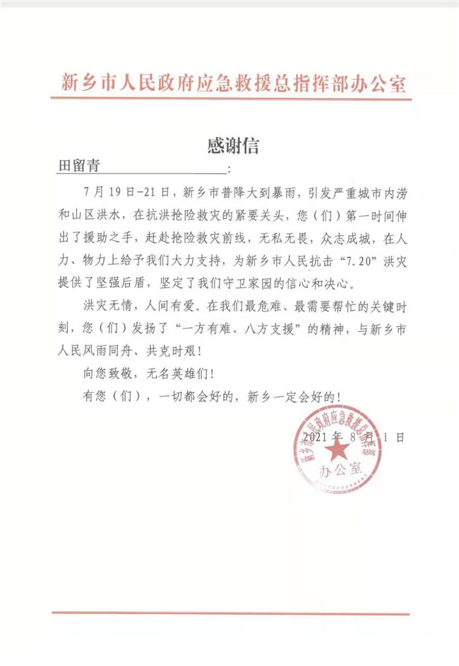 救援结束后田留青返回了家乡,他还收到了新乡市政府的感谢信。8月初,他又有了新的身份,成为社区的一名防疫志愿者。每天从早到晚,他一直在忙碌着:登记来访人员、量测体温、防疫消杀……“我也有一份清澈的爱,想要献给祖国和人民。”田留青希望自己能贡献出更多的青春力量。