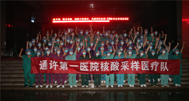 按照通许县新冠肺炎疫情防控指挥部要求,通许第一医院迅速组建两个梯队4个“百人团”,执行全员核酸检测任务。8月8日第一次检测,通许第一医院第一梯队400多名医护人员凌晨4点集结,分赴指定乡镇,两天时间圆满完成数十万名群众核酸检测任务。8月9日,该院第二梯队的医护人员对县城66个点位的10多万居民进行了核酸检测。8月13日凌晨4点半,雨一直在下,通许第一医院238名医护人员在雨中高喊着“服从命令,听从调遣,白衣战士,冲锋在前”的口号,迅速赶往指定地点,执行第二次全员核酸检测任务。