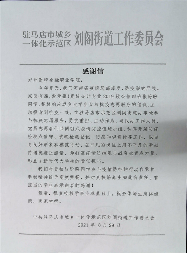 8月29日,中共驻马店市城乡一体化示范区刘阁街道工作委员会向该院发来感谢信,诚挚感谢19级会计信息管理4班张盼盼同学在疫情发生的第一时间投入到大学生志愿服务行动中,勇于担当、主动作为,在平凡的岗位上用不平凡的奉献传递正能量。