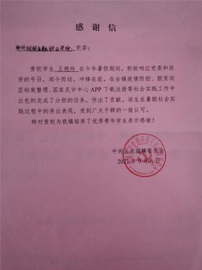 9月6日,中共鹿邑县王皮溜镇委员会向该院发来感谢信,诚挚感谢会计学院19级财务管理4班王艳玲同学在暑假期间在全镇疫情防控、脱贫攻坚、国家反诈中心APP下载注册等工作中做出的突出贡献。