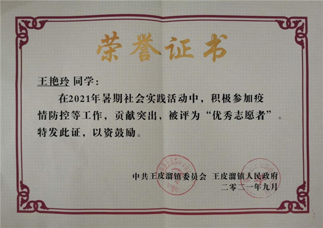 王艳玲同学在志愿服务工作期间,开展返乡人员信息登记、收取核酸检测报告以及宣传疫情防控相关知识等工作。同时,为了响应国家号召她组织每村每户下载注册“国家反诈中心”APP,得到了镇书记和值班领导的一致好评,并被中共鹿邑县王皮溜镇委员会 王皮溜镇人民政府评为“优秀志愿者”。