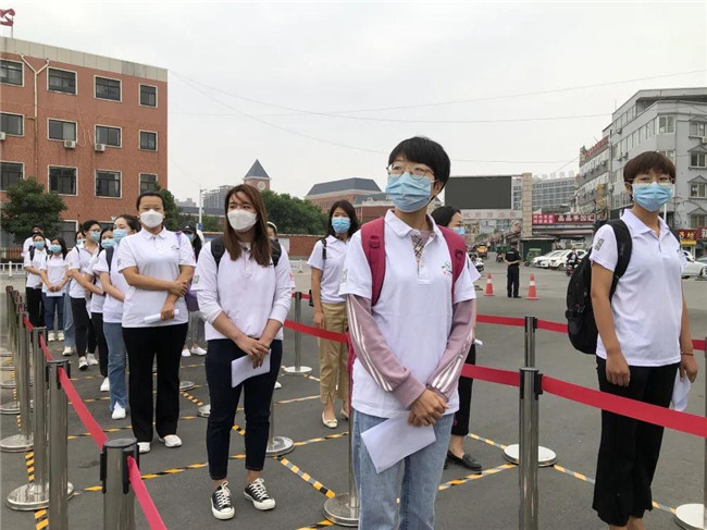 进入校园之后,学生们在间隔距离范围内等待完成报到手续办理。学生提交健康状况审核材料,领取入驻宿舍凭证。