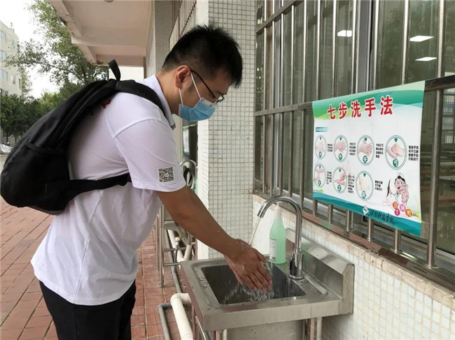 学校提前对教室进行打扫、通风及消杀工作。学生在教学楼前间隔1米进行排队,检查无异议之后,学生经过消毒进入教学楼。