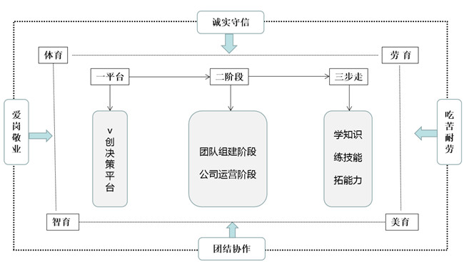 “两个阶段”:是指团队组建阶段和公司运营阶段,团队组建阶段包括组织机构CEO选举及公司员工的招聘、团队团建及企业文化等建设,公司运营阶段主要包括公司的注册成立、公司经营策略的制定和调整、公司业务的开展等,两个阶段的进行都是以学生为主体,充分体现放权给学生以提升学生综合能力。
