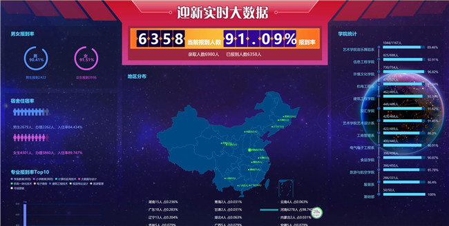 又是一年迎新季,漯河职业技术学院大屏幕上展示的迎新大数据格外亮眼,大数据实时动态展示了学生的报到率、学生的分布、宿舍入住、各院系报到情况等多维度与迎新报到相关的信息,一目了然,这是漯河职业技术学院近年来通过信息化支撑引领学校教育教学改革的一个侧面。