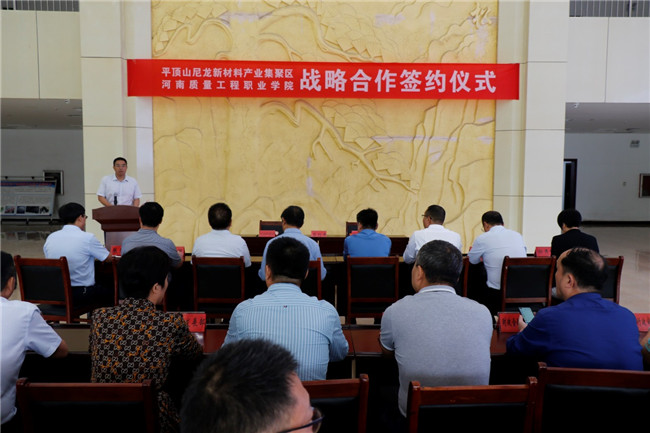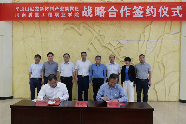 李鹏鹏表示,双方战略合作协议的签订和尼龙新材料产业学院的成立揭牌,是双方立足自身优势,共同致力于推动科技创新、成果转化、人才培养的重要举措,全面开启了平顶山尼龙新材料产业集聚区与河南质量工程职业学院合作发展的序幕,将以打造“一学院两中心一基地”为依托,全面探索校地良性互动合作机制,共同构建校地协同创新发展新格局,为尼龙新材料产业高质量发展提供强有力的人才支持、技能支撑和技术保障。希望双方以此为契机,进一步加强交流、深化合作,推动合作协议早日落地、早结硕果,为推进中国尼龙城高质量发展和全市产业转型升级作出积极贡献。