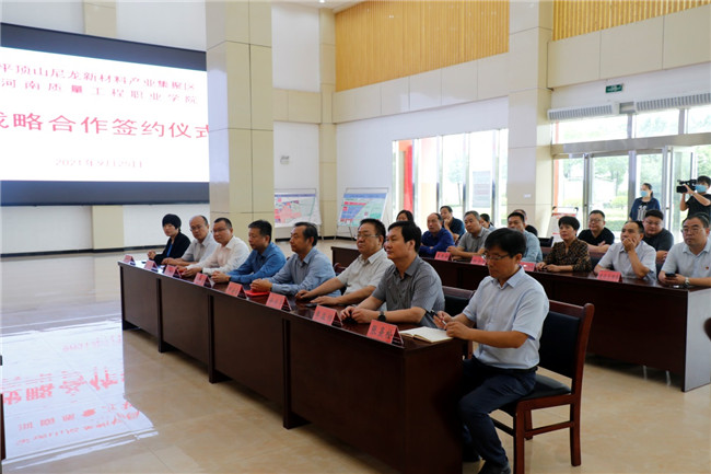 9月25上午,河南质量工程职业学院与平顶山尼龙新材料产业集聚区战略合作签约及尼龙新材料产业学院揭牌仪式在平顶山尼龙新材料产业集聚区综合公共服务中心举行。河南质量工程职业学院党委书记邱红标、院长郑海金、常务副院长徐宗华,平顶山尼龙新材料产业集聚区党工委书记李明、管委会主任李鹏鹏出席仪式。仪式由李明主持。