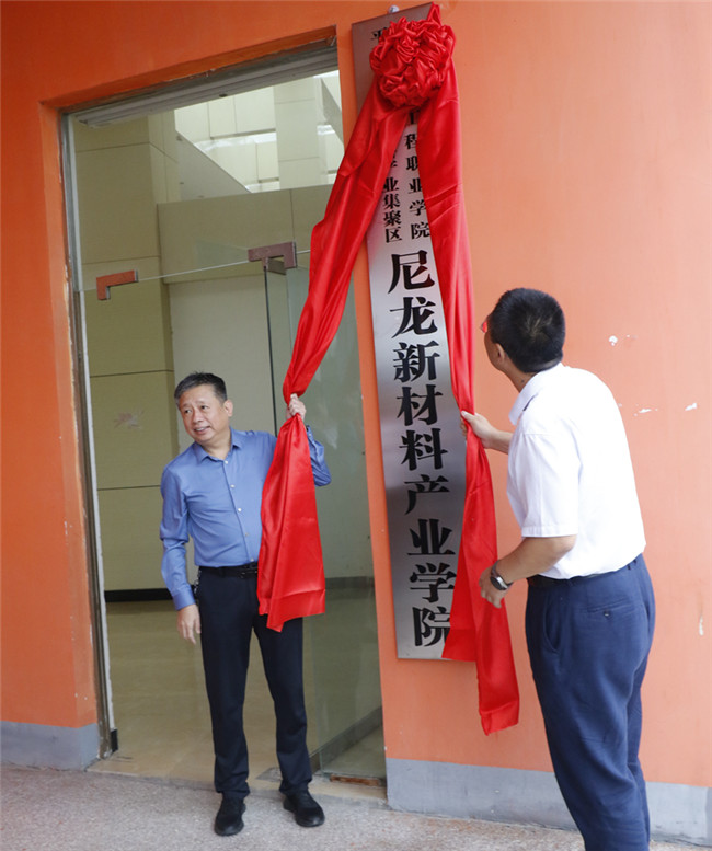 邱红标和李明共同为尼龙新材料产业学院进行了揭牌。郑海金和李鹏鹏分别代表双方致辞。
