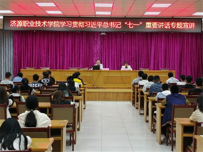 9月26日晚,济源职业技术学院在成教中心(电大)报告厅举办学习贯彻习近平总书记“七一”重要讲话专题宣讲报告会,邀请济源示范区新时代宣讲师、学院副教授高中和为师生宣讲习近平总书记在庆祝中国共产党成立100周年大会上的重要讲话精神,学院基础部师生代表参加报告会。