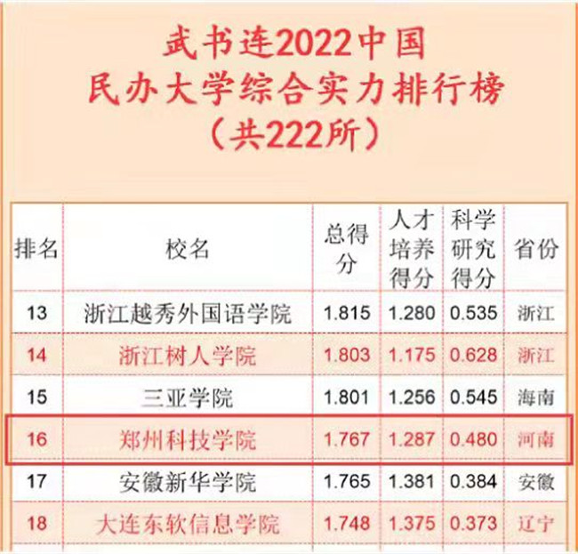 近日,由中国管理科学研究院《中国大学评价》课题组组长武书连主持所著、中国统计出版社出版的《挑大学选专业——2022高考志愿填报指南(民办大学和独立学院版)》一书发行,并公布了武书连2022中国民办大学和独立学院排行榜,郑州科技学院榜上有名,名列武书连2022中国民办大学综合实力排行榜全国第16位。