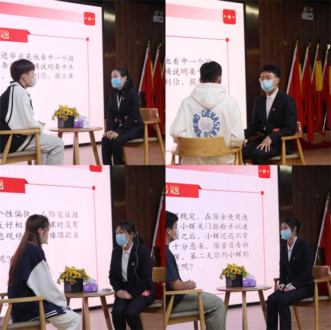 决赛现场以辅导员与学生情景再现的方式开展谈心谈话,题目围绕高校学生日常教育管理中常见的热点、难点问题进行设计,针对学生学业、就业、情感、心理等多方面问题,考察辅导员综合运用理论知识和工作技能分析问题、判断问题、解决问题的能力。比赛现场,参赛辅导员睿智机敏、沉着冷静,思维缜密,充分展现了该院辅导员队伍良好的职业素养和精神风貌。