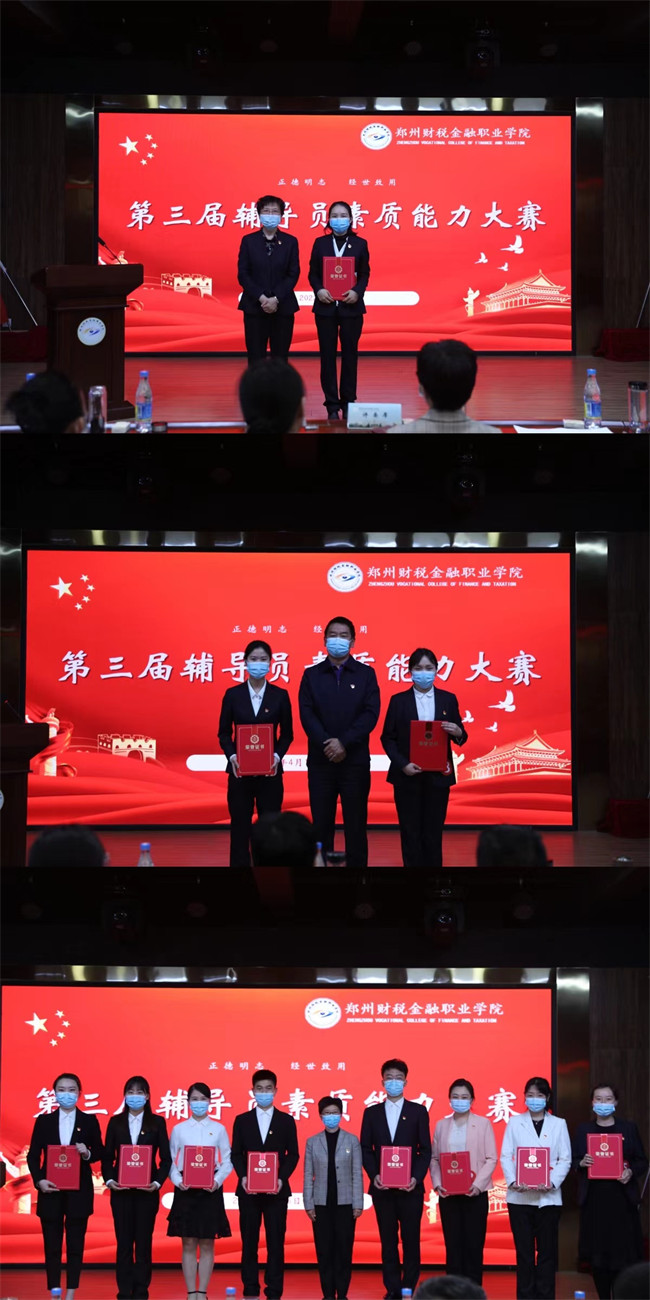 经过激烈的角逐,经济管理系辅导员刘凤娟荣获一等奖,同时她也将代表学校参加全省辅导员素质能力大赛;信息技术系辅导员程丹丹、商贸系辅导员程首一荣获二等奖;会计学院辅导员李旋、吴冰倩、李宇佳、赵瞳瞳、赵子涵、安艺、王卫楠、金融学院辅导员韩励荣获三等奖。