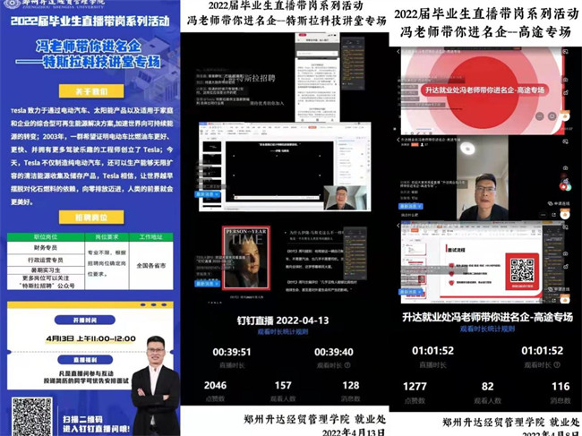 从2022年4月始,学校又创新开启了“冯老师带你进名企”直播带岗系列活动。通过这种方式,学校迅速接洽了华为集团、特斯拉科技、青岛啤酒、高途教育、菜鸟网络等10余家知名企业,为毕业生线上求职提供硬核支撑。让“直播带岗”实现毕业生与企业的精准连接,降低双方求职成本,真正帮助毕业生实现快速就业。