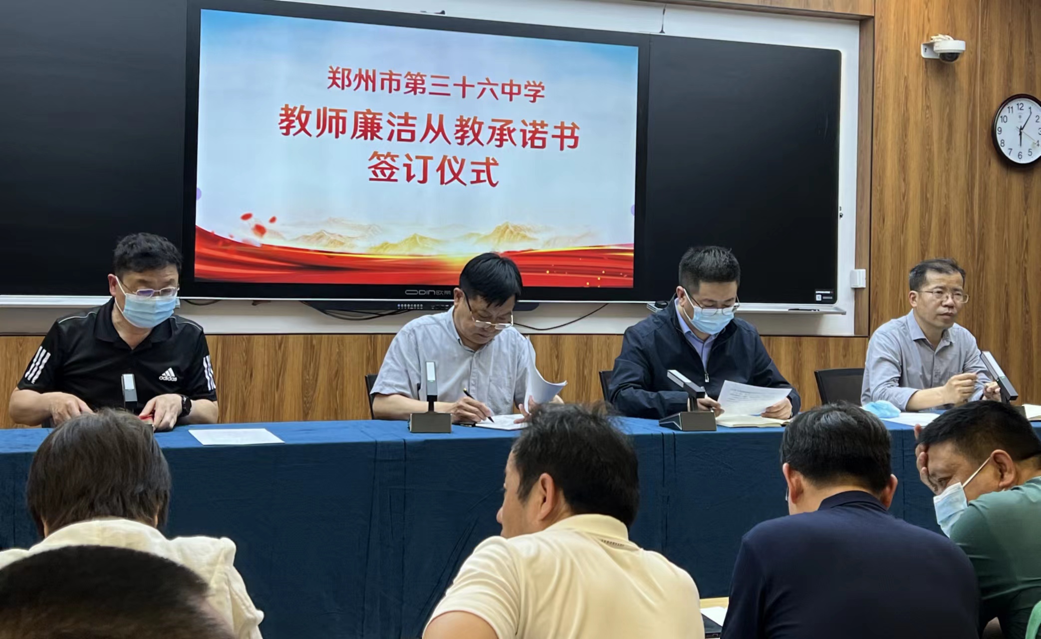 为加快推进清廉学校建设,积极培育和践行以清为美、以廉为荣的价值观,打造风清气正的校园氛围,2022年4月11日下午,郑州市第三十六中学举行了教师廉洁从教承诺书签订仪式。