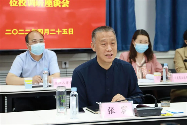 考察结束后,与会人员在课程与培训学院进行了座谈。学校党委书记张震介绍了学校基本情况和特色办学经验,详细解读了学校从“把企业引到学校”,到“把学校办到企业”,再到“校企共建产业学院”,“线场模式”构建校企命运共同体,让产教融合、校企合作落地生根的具体实践。党委副书记鲁俊民从开展“四全一促”工作、培养“红匠人才”、有效开展创新性党建活动等六个方面汇报了学校打造高质量党建的做法和成效。学校相关部门和二级学院负责同志分别发言。