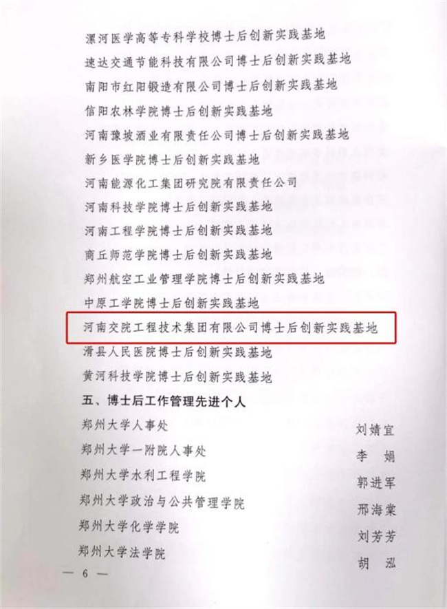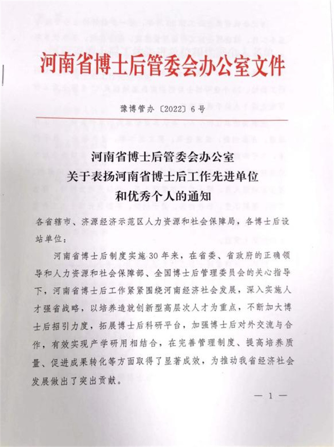 近日,河南省博士后管委会办公室印发《关于表扬河南省博士后工作先进单位和优秀个人的通知》,对10个博士后工作先进单位、15个优秀博士后科研流动站、22个优秀博士后科研工作站、26个优秀博士后创新实践基地以及60名博士后工作管理先进个人给予通报表扬。河南交通职业技术学院博士后创新实践基地脱颖而出,获评“优秀博士后创新实践基地”,校属交院技术集团办公室主任王菲菲荣获“博士后工作管理先进个人”荣誉称号。