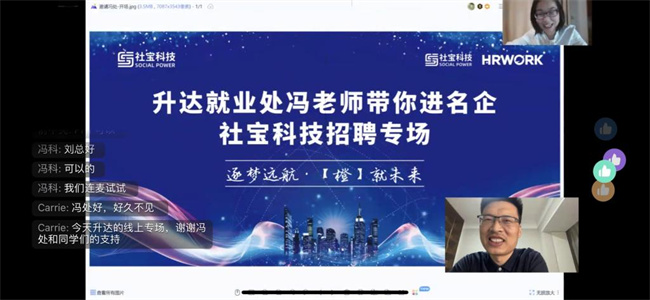 5月11日上午,郑州升达经贸管理学院就业处举办了2022届毕业生第七场“就业处冯老师带你进名企——社宝科技专场”直播带岗活动。就业处处长冯科老师在钉钉平台上为毕业生求职牵线搭桥,邀请由学校优秀校友李贤威创办的社宝信息科技有限公司云端宣讲招聘,社宝科技首席人才官刘碧林女士、人力资源总监胡晓燕女士为毕业生直播带岗,学校各专业200余名毕业生参加了此次活动。