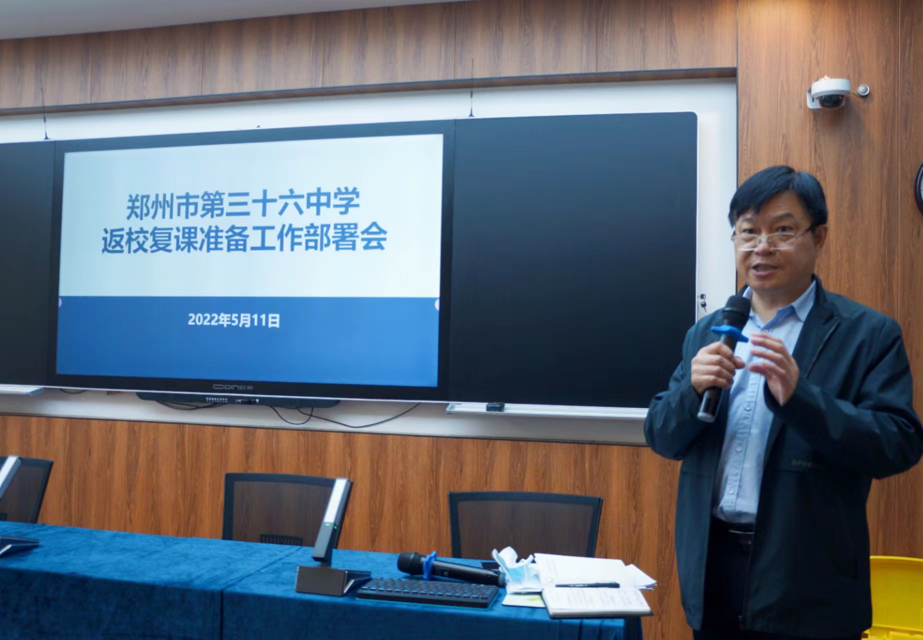 2022年5月11日上午,为坚决阻止疫情向校园扩散,确保我校返校复课工作安全、平稳、有序开展,郑州市第三十六中学召开返校复课准备及疫情防控工作部署会,全面部署返校复课各项准备及疫情防控工作。