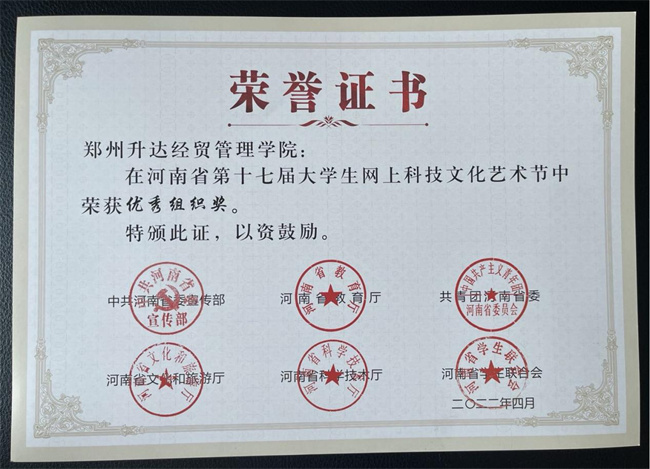 近日,河南省第十七届大学生网上科技文化艺术节比赛结果揭晓,郑州升达经贸管理学院喜获“优秀组织奖”,在各分项比赛中,获得一等奖1项、二等奖6项、三等奖10项。