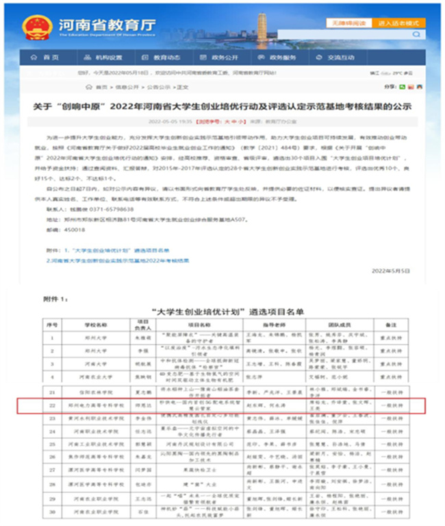 “创响中原”2022年河南省大学生创业培优行动是河南省进一步提升大学生创业能力,助力大学生创业项目可持续发展,有效推动创业带动就业的重要举措。根据河南省教育厅安排,经郑州电力高等学校推荐、资格审查、省级评审,省教育厅最终从全省高校(含本、专科)申报的优秀创业项目中,评审遴选出30个项目入围“大学生创业项目培优计划”,并给予资金扶持。