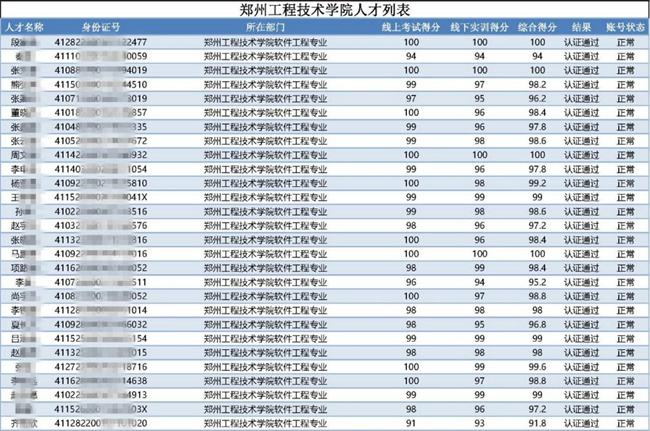 为贯彻落实《中共郑州市委组织部关于印发郑州数字人才培养工作实施方案的通知》(郑组通〔2021〕82号)精神,更好服务郑州市数字经济高质量发展,为数字人才认定和推荐就业提供依据,郑州工程技术学院作为郑州市数字人才培养计划首批试点院校,组织信息工程学院691名相关专业学生参加2022年度郑州市数字人才综合测评。该校参加此次测评的学生全部顺利通过认证,并颁发郑州市数字人才培养评价联盟、数字郑州产业生态联盟人才入库证书。