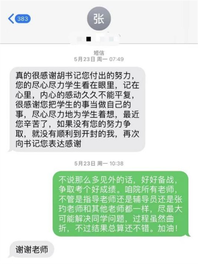 小张同学给辅导员和副书记都发了很长的信息,她说:“真心感谢老师们付出的努力,老师们的尽心尽力我们看在眼里、记在心里。很感激学校和老师把学生的事当做自己的事,全心全意地为学生着想。如果没有学校的协调、老师们的努力争取,就不可能这么顺利返回开封到达学校。”