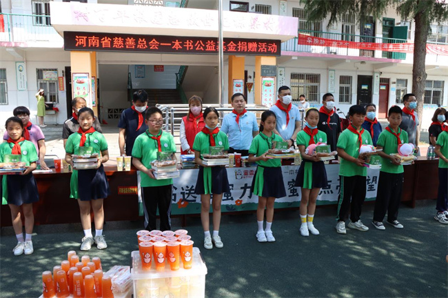捐赠活动现场,少先队员为与会嘉宾佩戴红领巾。河南省慈善总会一本书公益基金会穆迪老师在讲话中,表达了对同学们的殷切期望,希望同学们以书香为伴,在阅读中快乐成长。爱心企业蜜雪冰城代表尚星女士表示,将持续助力乡村教育,为乡村振兴贡献力量。竹园沟小学校长王丰珍表示,将在社会各界的关怀和帮助下,办好乡村基础教育,点亮学生成才梦想。