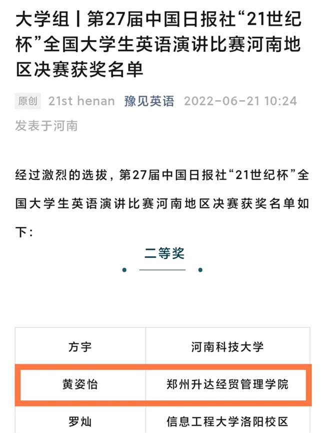 6月18日,中国日报社“21世纪杯”全国英语演讲比赛(河南赛区)如期在线上举行,本次比赛分为定题演讲,即兴演讲、现场问答三个环节。郑州升达经贸管理学院外国语学院翻译教研室李笑寒老师指导的2020级翻译专业学生黄姿怡经过初赛、复赛、决赛环节,根据中外专家评审结果,荣获个人二等奖。