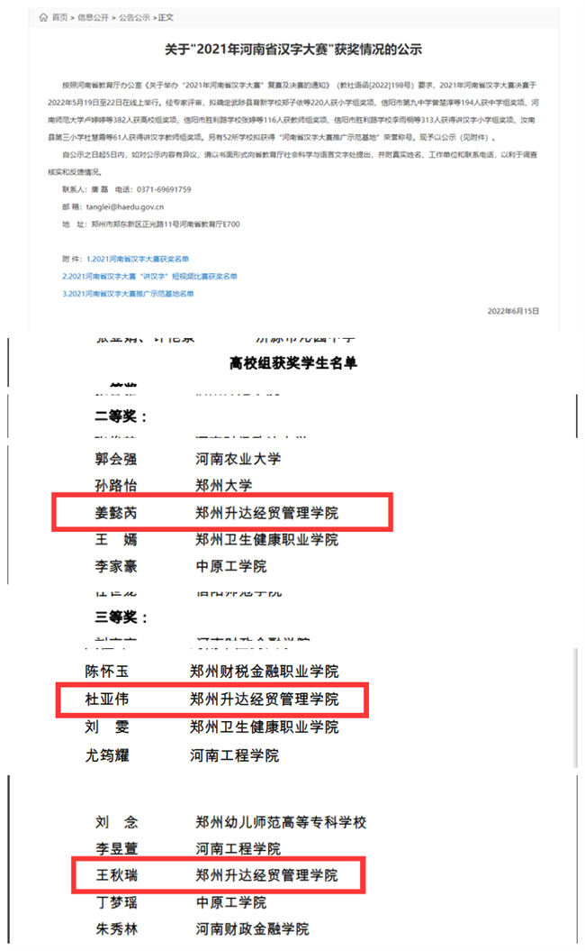 汉字是民族文化的化石,是历史的载体,郑州升达经贸管理学院语委将继续做好语言文字工作,加大普通话和规范汉字的推广力度,进一步提升学校学生综合素质,争取在下一届的省汉字大赛中再创佳绩。(王松洁 姜懿芮)