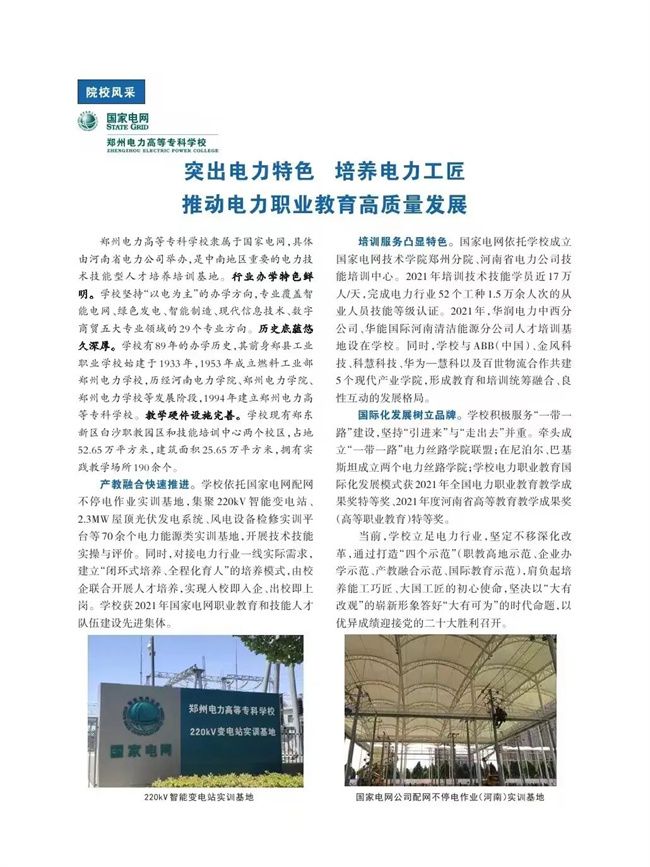 近日,《中国职业技术教育》2022年第15期宣传报道郑州电力高等专科学校,刊载《突出电力特色 培养电力工匠 推动电力职业教育高质量发展》专题报道文章,全方位展示学校风貌和办学成就,扩大了学校的社会影响力和美誉度。
