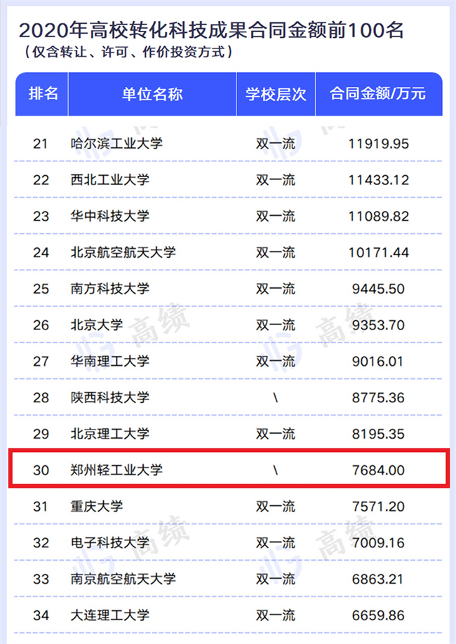6月29日,《中国科技成果转化2021年度报告(高等院校与科研院所篇)》在京发布。《报告》显示,在2020年高等学校以转让、许可、作价投资和技术开发、咨询、服务方式转化科技成果合同金额排行中,郑州轻工业大学以25349.38万元位居全国高校第71位,河南省高校第2位。在2020年高等学校以转让、许可、作价投资三种方式转化科技成果合同金额排行中,该校以7684万元位居全国高校第30位,河南省高校第1位。目前,该校已连续4年获得全国高校科技成果转化合同金额100强。