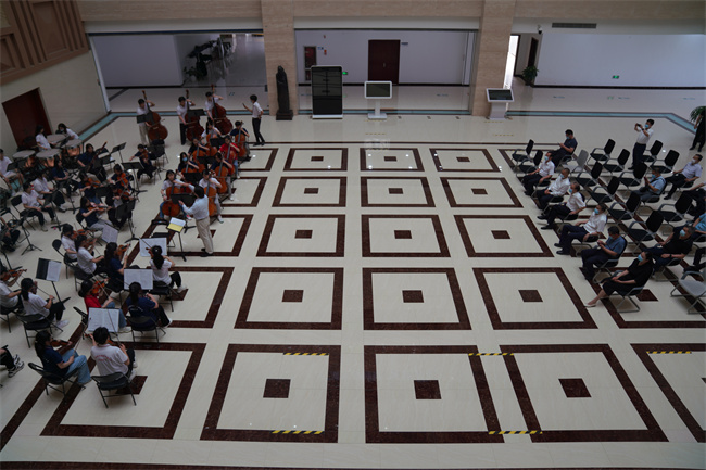 在图文中心二楼大厅,音乐学院交响乐团现场奏响了《我的祖国》。“一条大河波浪宽,风吹稻花香两岸……”当乐手们演奏起这段熟悉的旋律,台下听众不禁轻声哼唱起来,爱国之情在心中久久回荡。