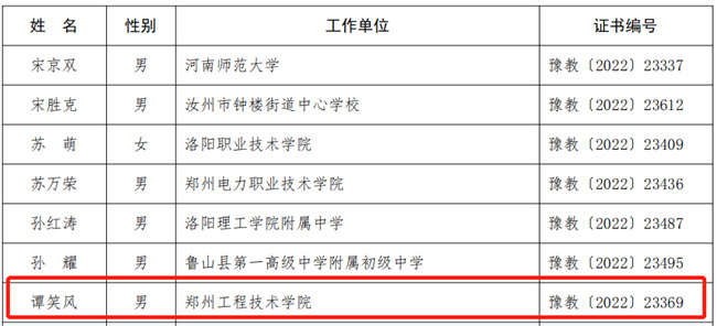 近日,根据《河南省教育厅办公室关于做好2022年优秀教育管理人才人选推荐工作的通知》要求,经基层推荐、专家评审、结果公示等程序,郑州工程技术学院马克思主义学院党总支书记谭笑风入选河南省教育厅优秀教育管理人才。