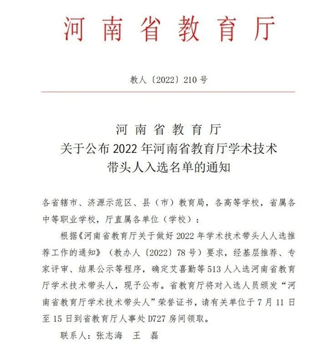 近日,河南省教育厅发布了《关于公布2022年河南省教育厅学术技术带头人入选名单的通知》(教人〔2022〕210号),郑州工程技术学院外国语学院(国际教育学院)王丽丽老师和信息工程学院朱志甫博士荣获“2022年河南省教育厅学术技术带头人”称号。
