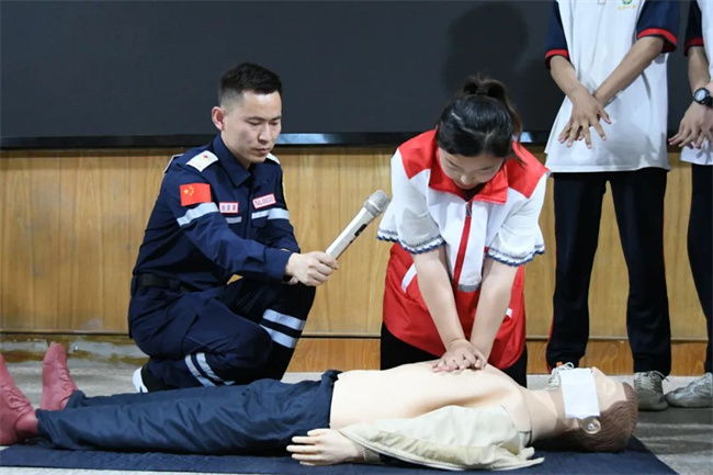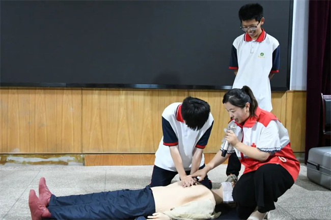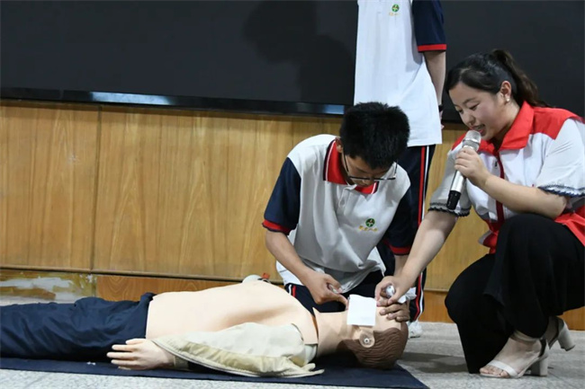 县红十字会应急救护培训讲师王慧丹,用通俗易懂的语言为师生讲解急救知识和技能,重点讲解了心肺复苏的流程和注意事项。通过实际操作演练,用人体模型给大家演示心肺复苏的整体操作流程,如何打开气道、做人工呼吸、定位按压、检查呼吸等环节。学生们争先恐后,都想体验下救助过程,县红十字会应急救护培训师王慧丹耐心讲解,师生们仔细聆听,不断巩固操作要领,通过心肺复苏实操演示,真正掌握了正确的急救方法,做好校园意外伤害和突发事件的应急处理,助力平安校园建设。并指导学生们进行现场演练,在有限的时间内向全校师生有效普及急救技能,收到良好的培训效果。